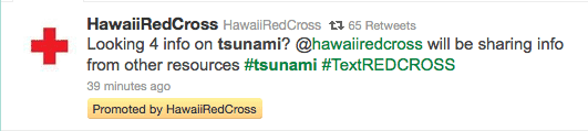 At Twitter, we’ve just put @HawaiiRedCross live with pro-bono promoted crisis tweets — they’ve been doing a phenomenal job curating quality information (as well as some on-the-ground reports) about Tsunami stuff. Huge thanks to Wendy and Cindy for working with me so early this AM on it;)